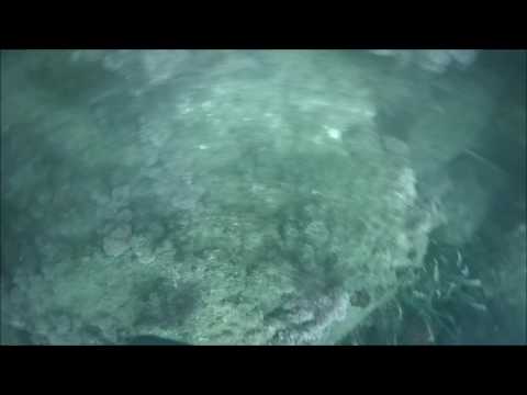 Esta vez, miré por los dos orificios que la losa presentaba en su unión con el lecho marino. Pude ver al mero mirándome. Así que, sin pensarlo, apunté al ojo y disparé. Supuse que le atravesé el ojo. Pero cogí un segundo fusil mas corto y le lancé un segundo arpón, también al ojo. Luego, me di cuenta, al día siguiente, cuando saqué al mero, que el primer arpón, solo le había penetrado en la barriga, mientras que el segundo le había atravesado el cerebro y había dejado al animal, vivo, pero anestesiado toda una larga noche y parte de la mañana del día siguiente, hasta que después de una hora y de realizar 33 bajadas, la edad de Jesucristo, pude descrucificar al mero, pues los arpones se habían colocado en cruz, impidiéndome sacar al epinephelus, epinephelus , pues mientras tiraba de uno de ellos, el otro hacía de palanca taponadora y travesaño, evitando la extracción del animal.